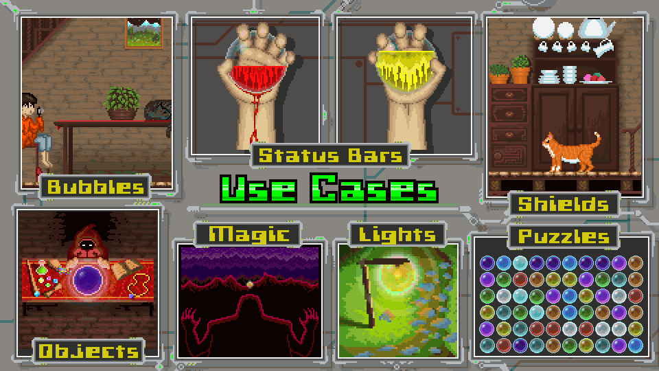 Upgrade your pixel art game with this high quality Bubble pack. whether it be Force Fields or Barriers around your characters, Life & Mana bars for your UI, Unique Objects in your world, or Toxic Bubble Attacks from enemies. This pack has you covered!